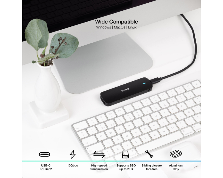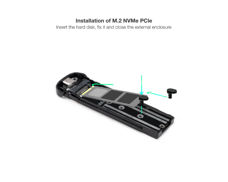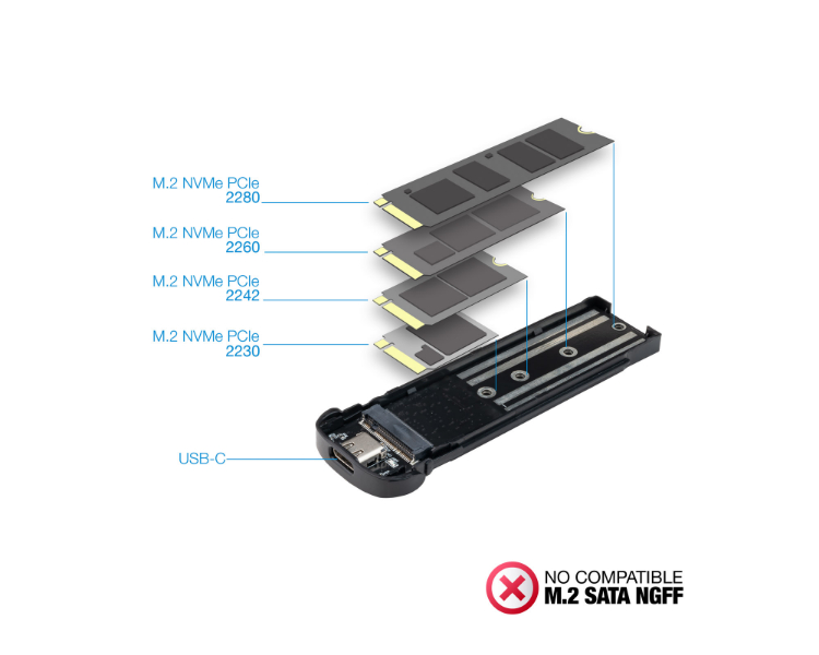 2230, 2242, 2260, 2280/ Compatible con NVMe/ Carcasa de aluminio/ Apertura fácil sin tornillos