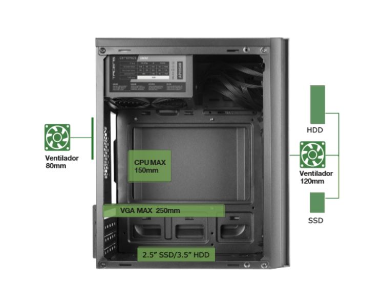 Bahias: Internas: 2 x 3'5, 2 x 2'5 Color del Producto: Negro Conectores: USB 2.0 x 1, USB 3.0 x 1, Audio In/Out F.A.: Si Formato: Micro ATX Formato F.A.: ATX Medidas: 291 x 188 x 345 mm Potencia F.A.: 500W