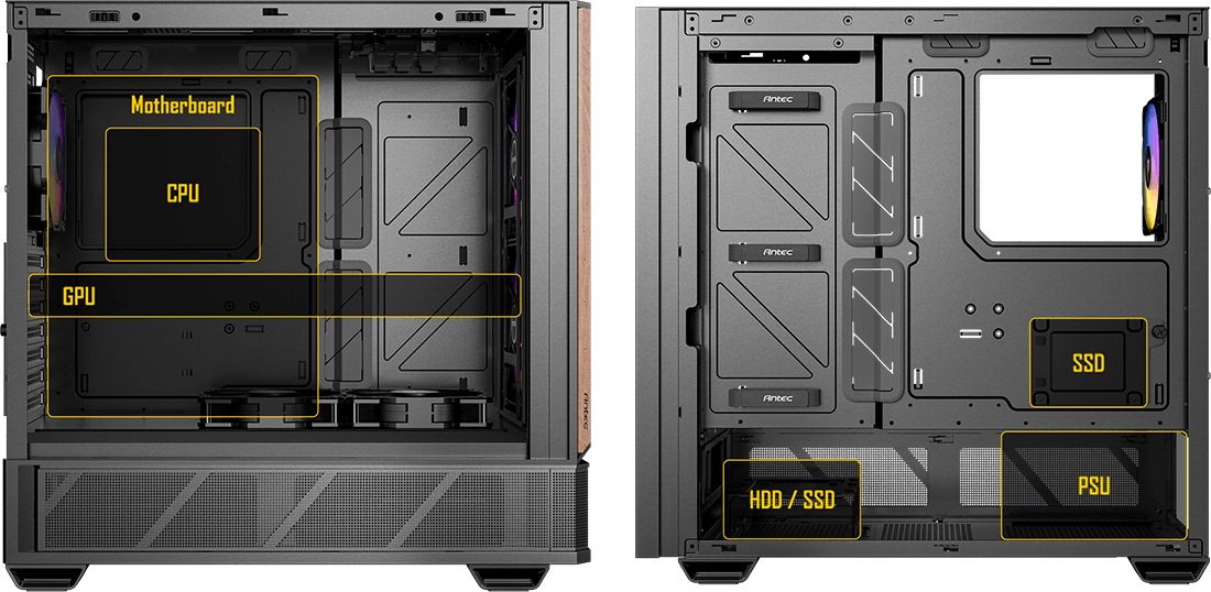 Mid Tower / GPU 405 mm / 2×SSD + 2×HDD / 2×USB 3.0 + 1×USB-C + Audio / ARGB