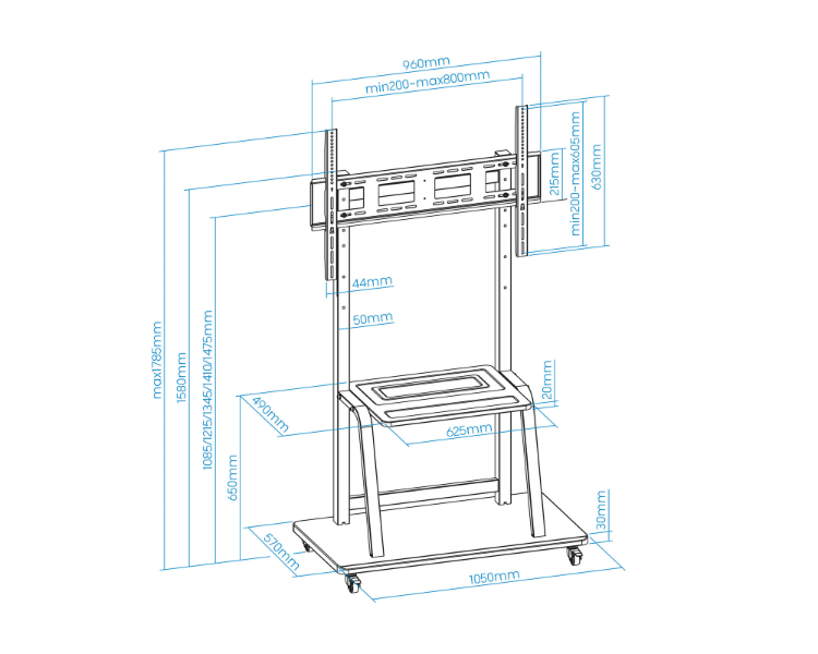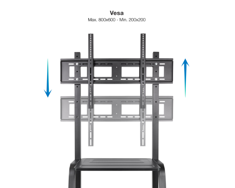 De 37 a 100"/ VESA Máximo 800x600mm/ Hasta 150kg/ Regulación de altura en 5 posiciones/ Bandejas multiusos