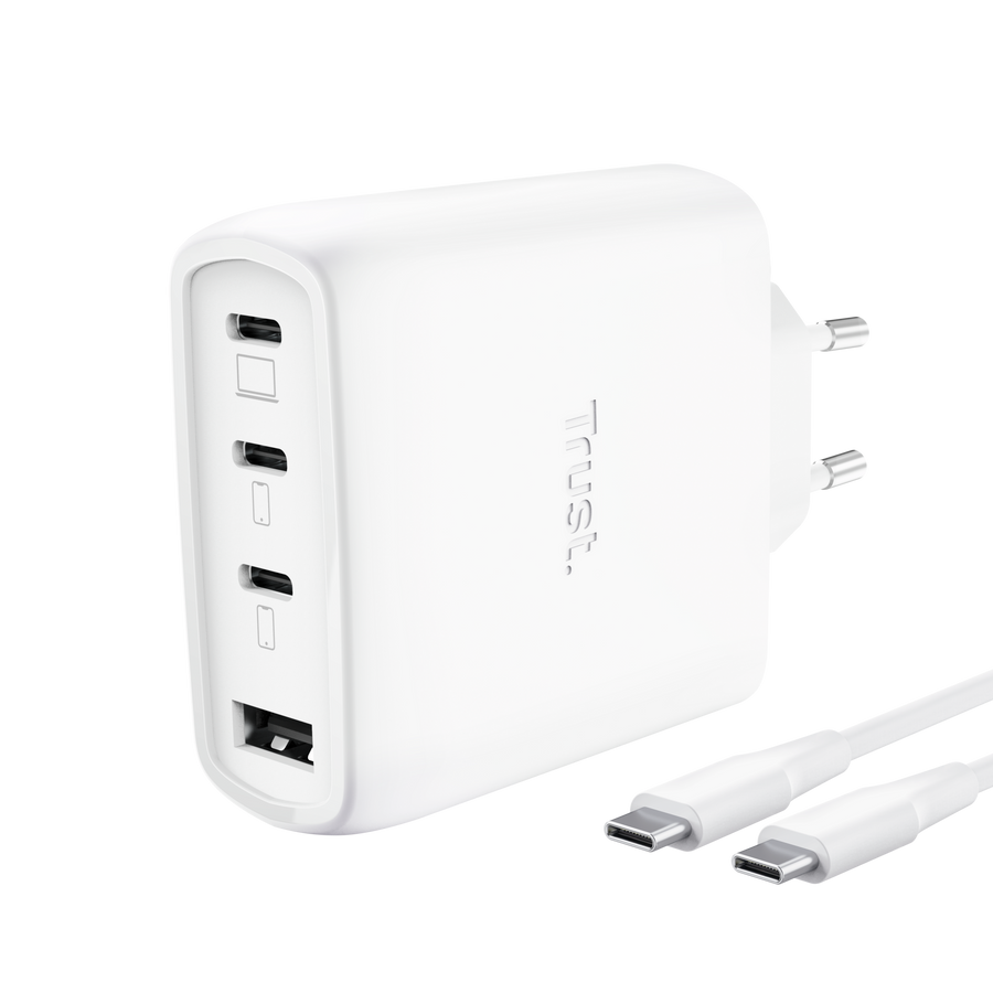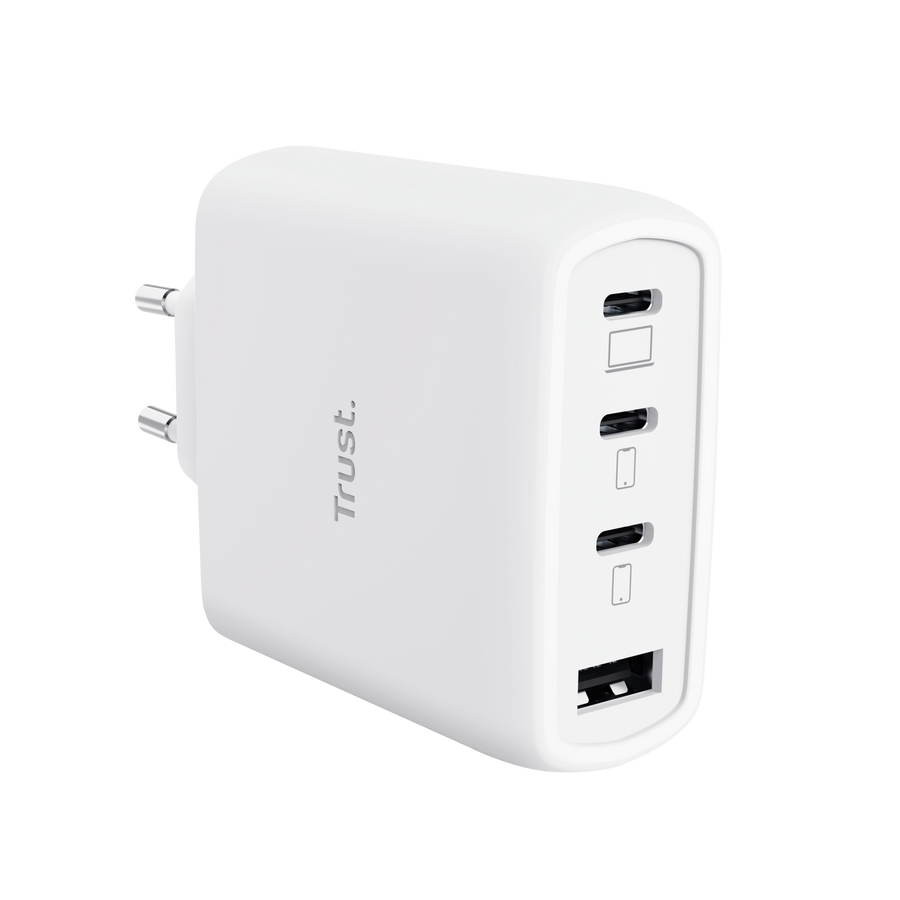 Cargador USB GaN 65W con 3 USB-C y 1 USB-A para hasta 4 dispositivos.